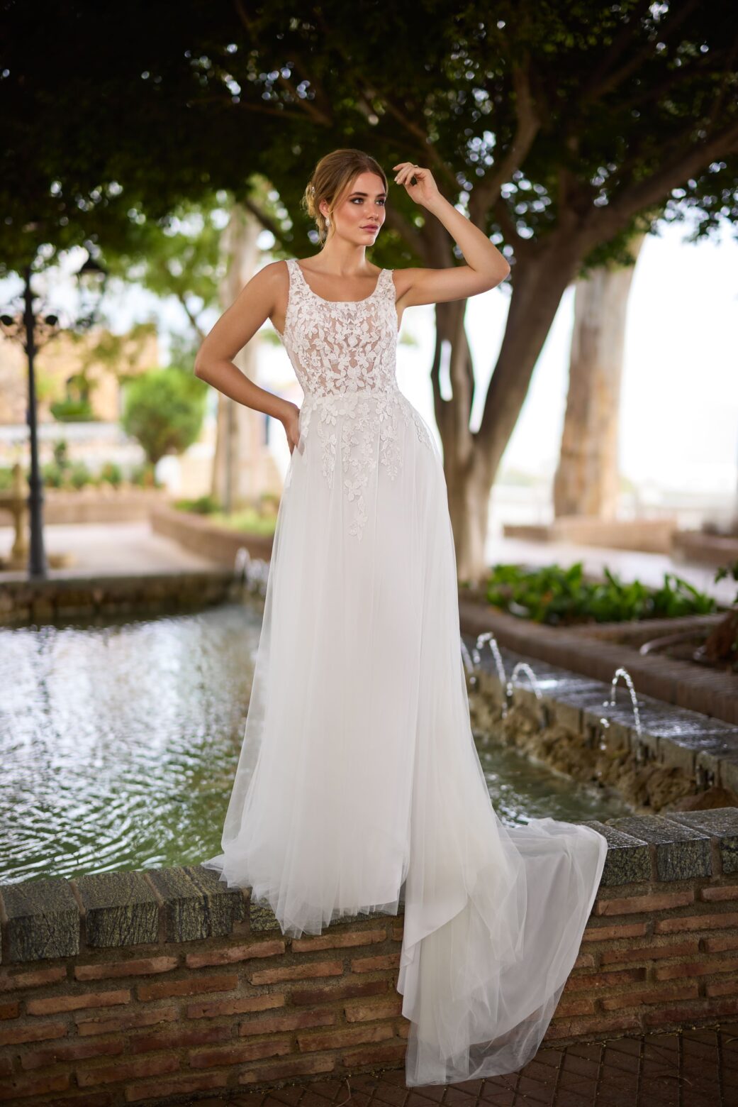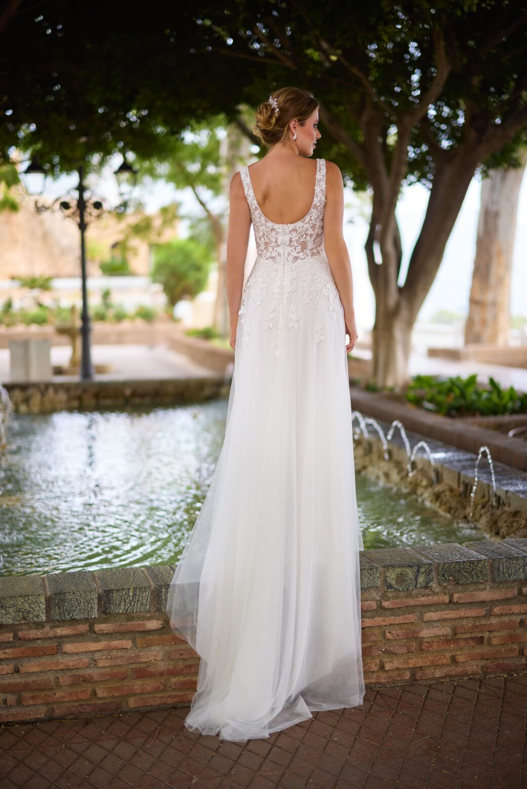 Das Mieder ist in semitransparenter Optik gehalten, wodurch die floralen Spitzenapplikationen wie schwebend auf der Haut wirken. Breite Träger und ein tiefer Rundrücken sorgen für eine offene, zugleich sichere Passform. Der Übergang von der feinen Spitze in den luftigen Rock wirkt besonders harmonisch und macht das Kleid zu einem zeitlosen Begleiter. Eine kleine Schleppe rundet den festlichen Auftritt ab.