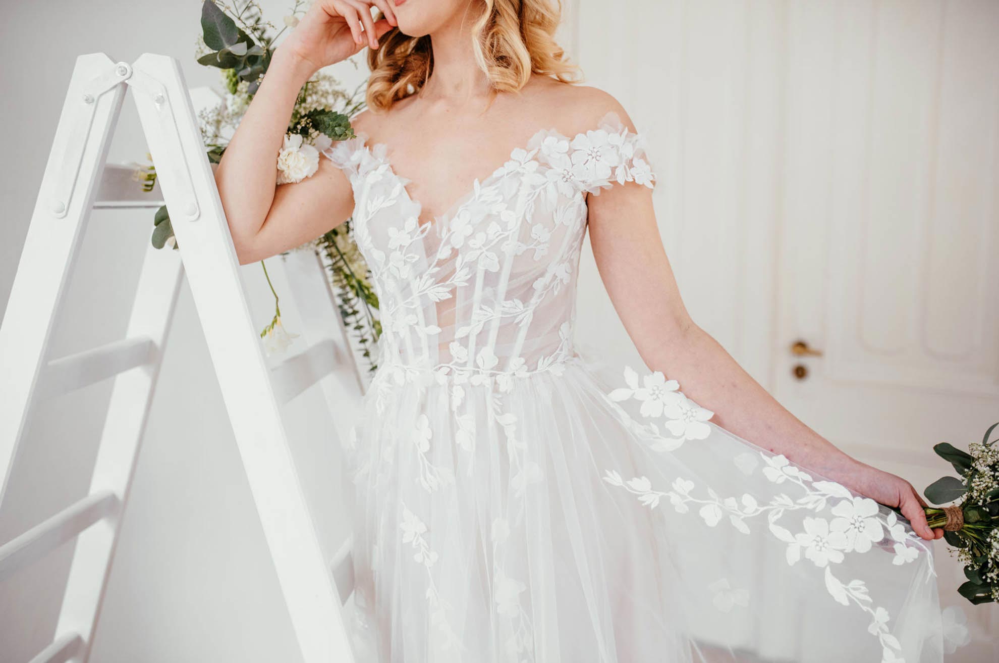 Der weiche, fließende Tüllrock fällt in eleganten Wellen und wird durch feine, applizierte Blüten veredelt, die dem Kleid eine märchenhafte Leichtigkeit verleihen. Der zarte Farbton des Kleides, ein dezentes Elfenbein, harmoniert perfekt mit den floralen Applikationen und unterstreicht den romantischen Charakter des Modells.