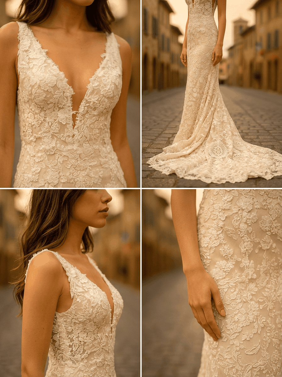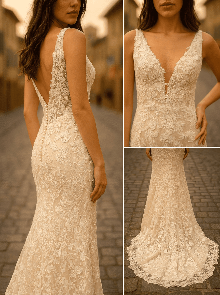 Das Modell präsentiert sich in einer Fit-&-Flare- bis Mermaid-Silhouette, die den Körper sanft modelliert und ab Kniehöhe in einen weich ausgestellten Saum übergeht. Der tiefe V-Ausschnitt wird durch feinen Illusion-Tüll subtil abgesichert und sorgt für ein stilvoll betontes Dekolleté. Besonders edel ist die durchgehende florale 3D-Spitze, die sich über das gesamte Kleid legt und auf einem warmen Nude-Unterton besonders plastisch zur Geltung kommt. Die breiteren Spitzenträger gehen harmonisch in einen tiefen V-Rücken über, der mit einer filigranen Knopfleiste im unteren Rückenbereich veredelt ist. Der weich auslaufende Spitzensaum und die elegante Schleppe schenken dem Kleid eine traumhafte Bewegung und einen luxuriösen Abschluss.