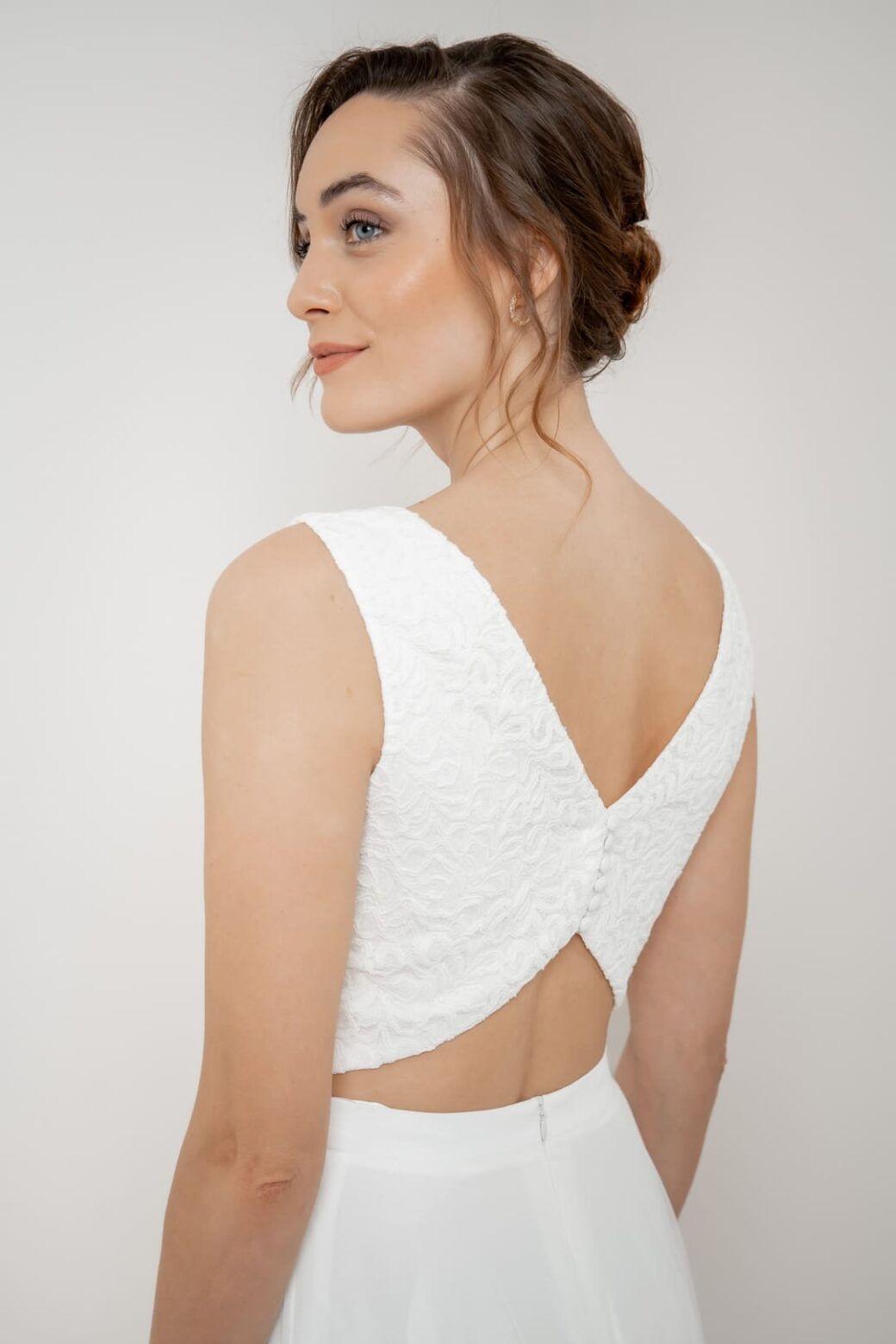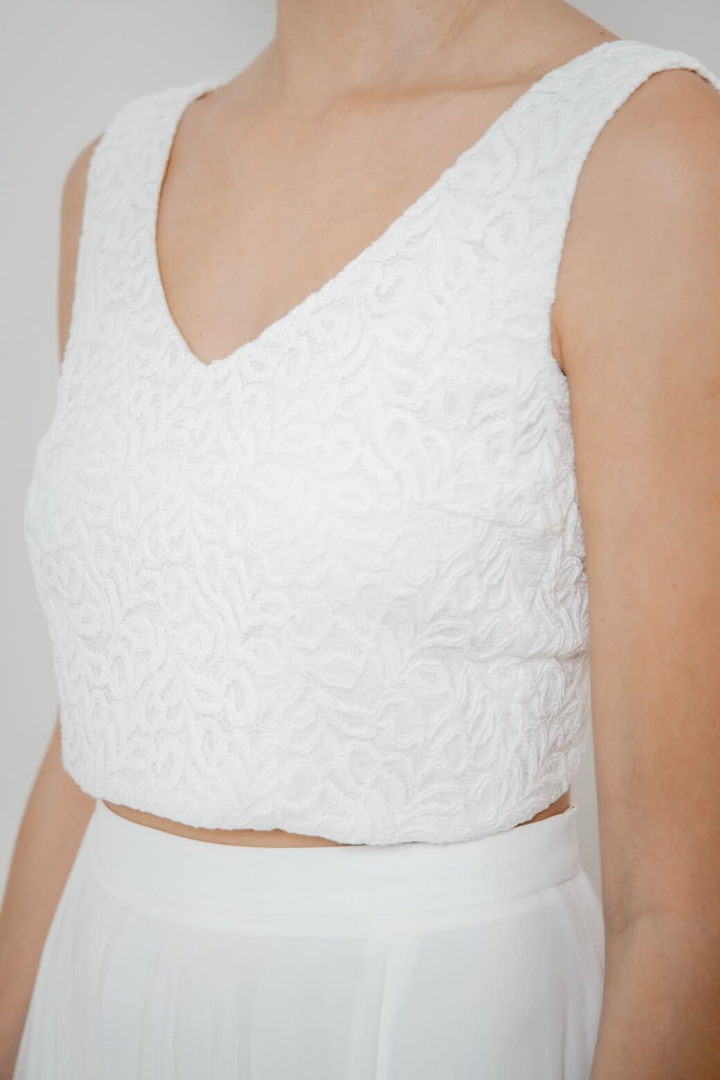 Die Vorderseite zeigt sich mit einem sanft geschwungenen V-Ausschnitt, der das Dekolleté dezent betont. Der strukturierte Stoff mit feiner, reliefartiger Musterung verleiht dem Top eine spürbare Tiefe und schmeichelnde Haptik. Die Rückseite überrascht mit einem tiefen V-Ausschnitt, der sich elegant überkreuzt und durch eine Knopfleiste akzentuiert wird – ein subtiler Blickfang, der modern und sinnlich zugleich wirkt. Das verkürzte Design macht das Top ideal in Kombination mit Brauthosen oder Röcken und schenkt maximale Bewegungsfreiheit.