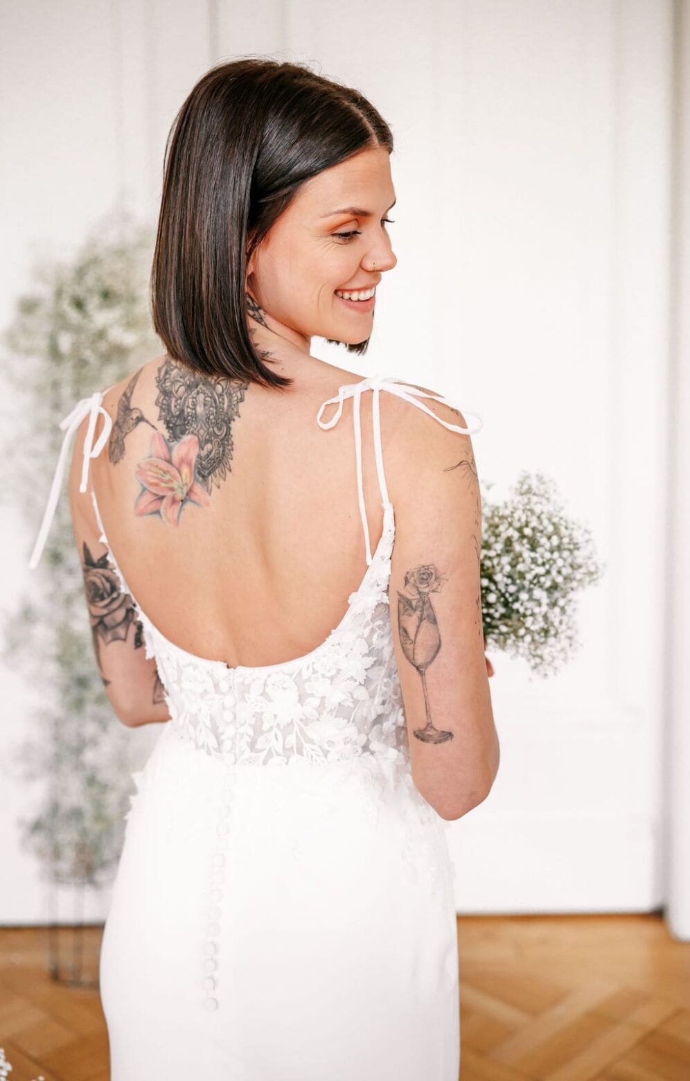Mit Gwen haben Bräute die Freiheit, ihren Auftritt flexibel zu gestalten: Tagsüber festlich-romantisch mit Rockaufsatz, abends modern und elegant ohne. Dazu passen schlichte, lange Ohrringe und ein locker gestecktes Haar, das den offenen Rückenausschnitt unterstreicht.