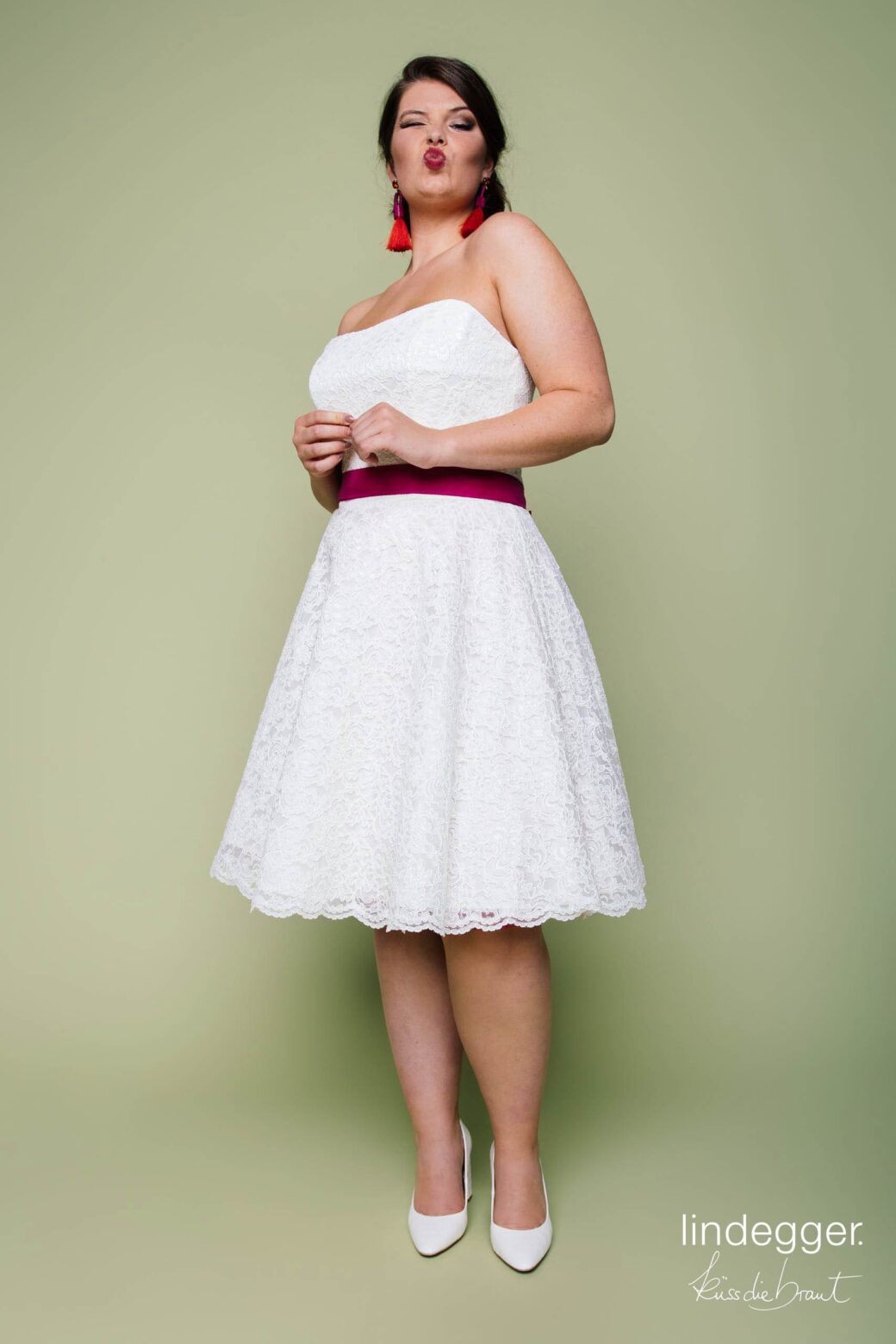 Kurzes Spitzen-Brautkleid mit farbigem Taillenband – verspielt & modern