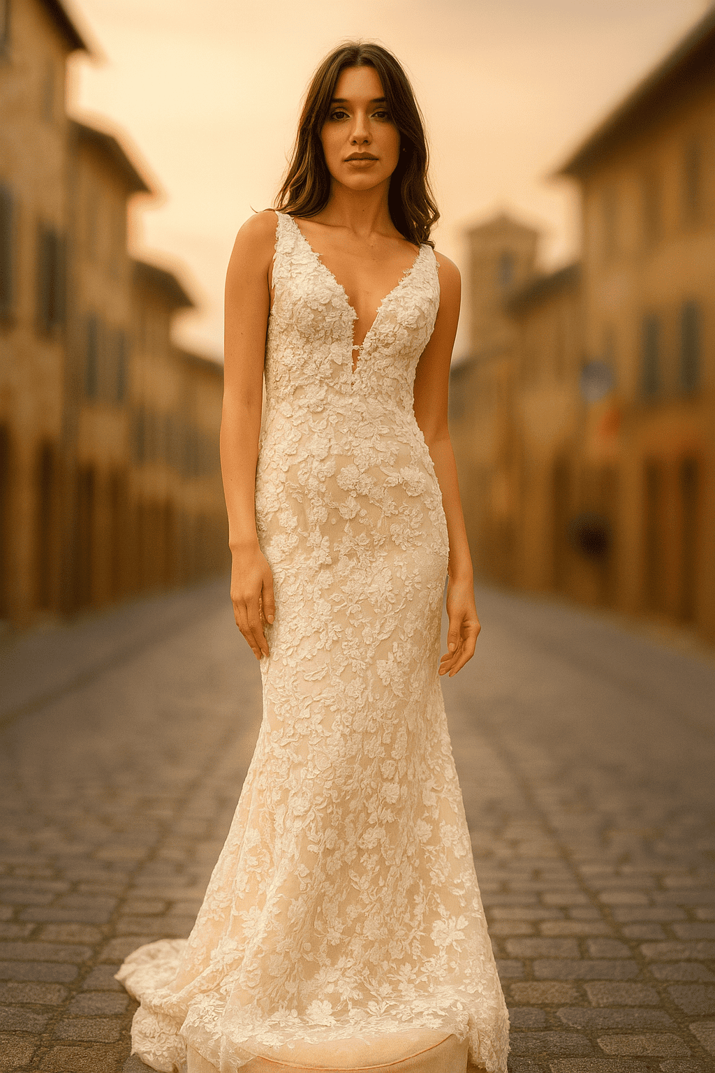 Beschreibung Elegantes Fit-&-Flare-Brautkleid mit floraler 3D-Spitze und tiefem Rückenausschnitt Dieses Brautkleid von Lina Becker ist pure feminine Raffinesse. Die körpernahe
